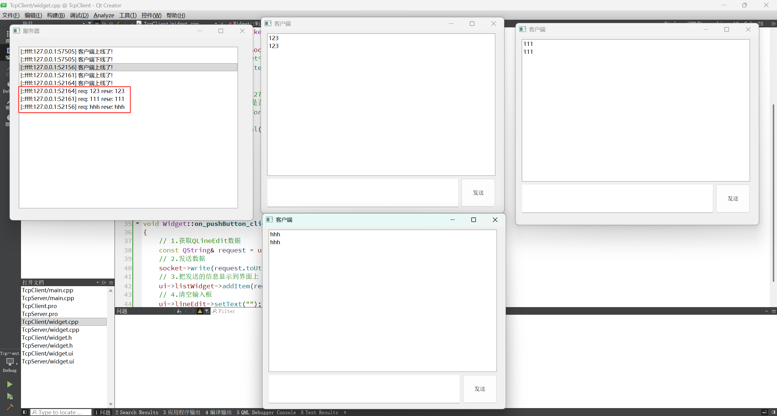 6、下面进行测试,我们启动一个服务器,然后找到客户端构建的临时文件build-xxx,然后找到debug目录下的可执行程序,我们运行两个客户端。然后进行通信。