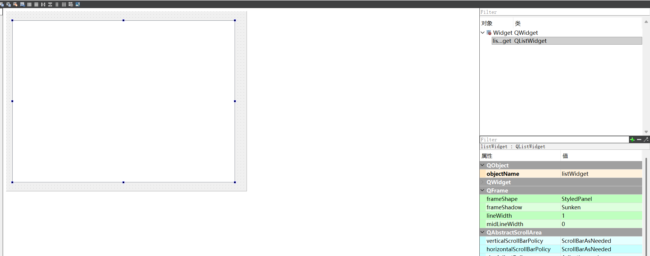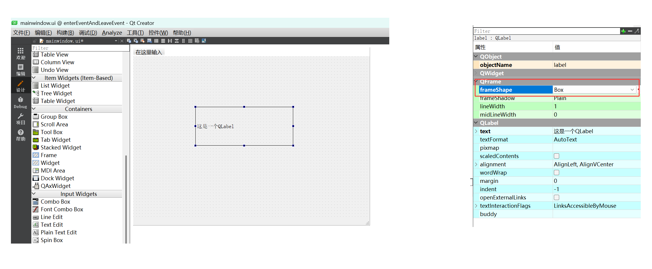 首先创建一个QLabel,然后为了方便测试,设置右侧属性的frameShape为Box。
