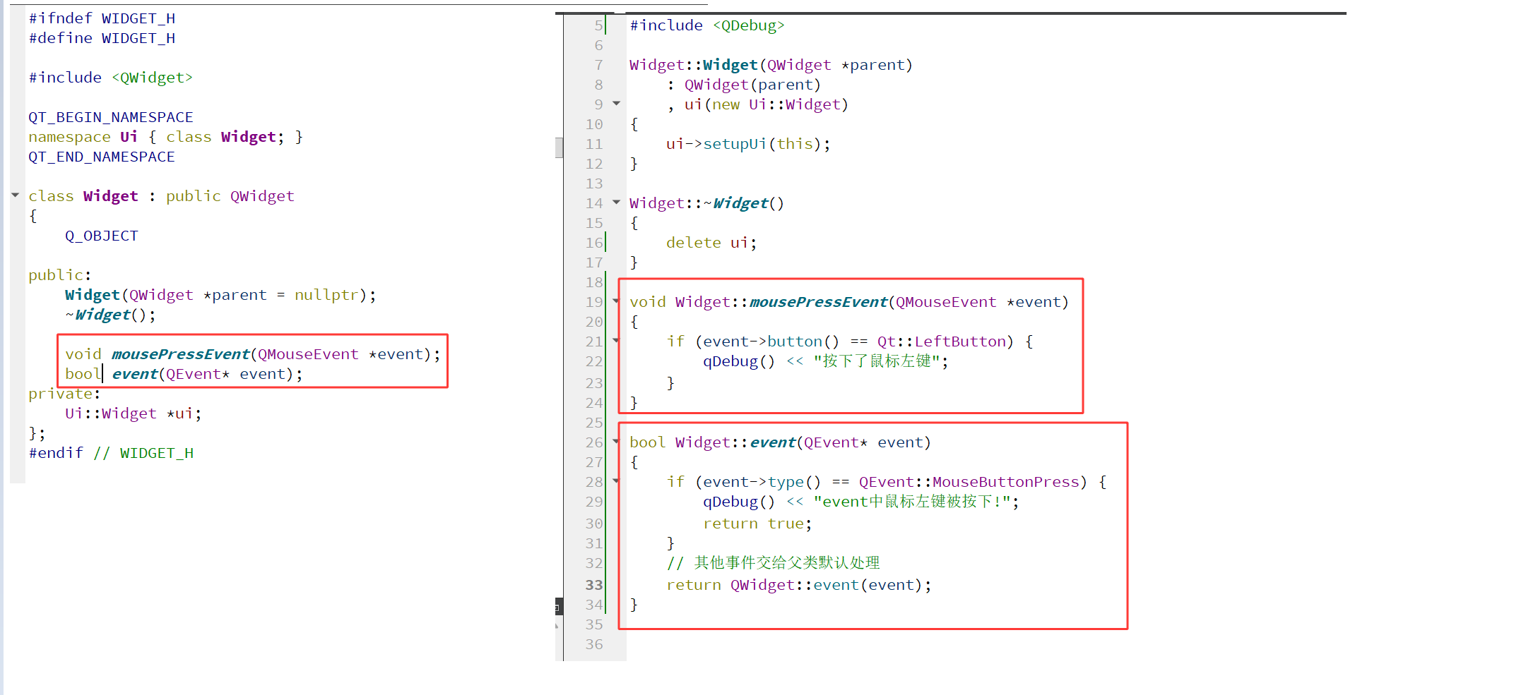 下面通过代码实现一个样例:创建一个新项目,然后在Widget类中重写event和mousePressEvent函数,然后在event中拦截该事件处理函数。