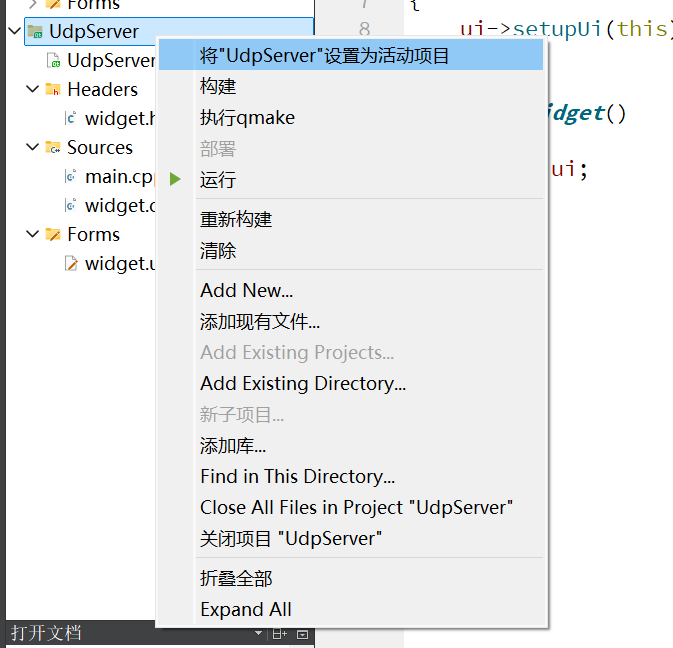 3.1、虽然打开了两个项目,但是我们仔细看会发现我们新建的UdpClient项目的字体是更粗的。这时候运行项目的时候就是编译构建UdpClient。那如果我们需要修改为UdpServer,运行的时候就运行UdpServer这个项目,需要对着项目右击,修改为活动项目。
