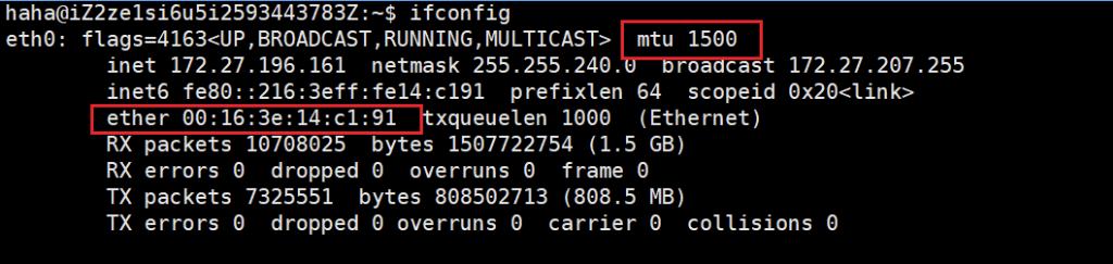 使用ifconfig命令就可以查看自己的MAC地址与MTU
