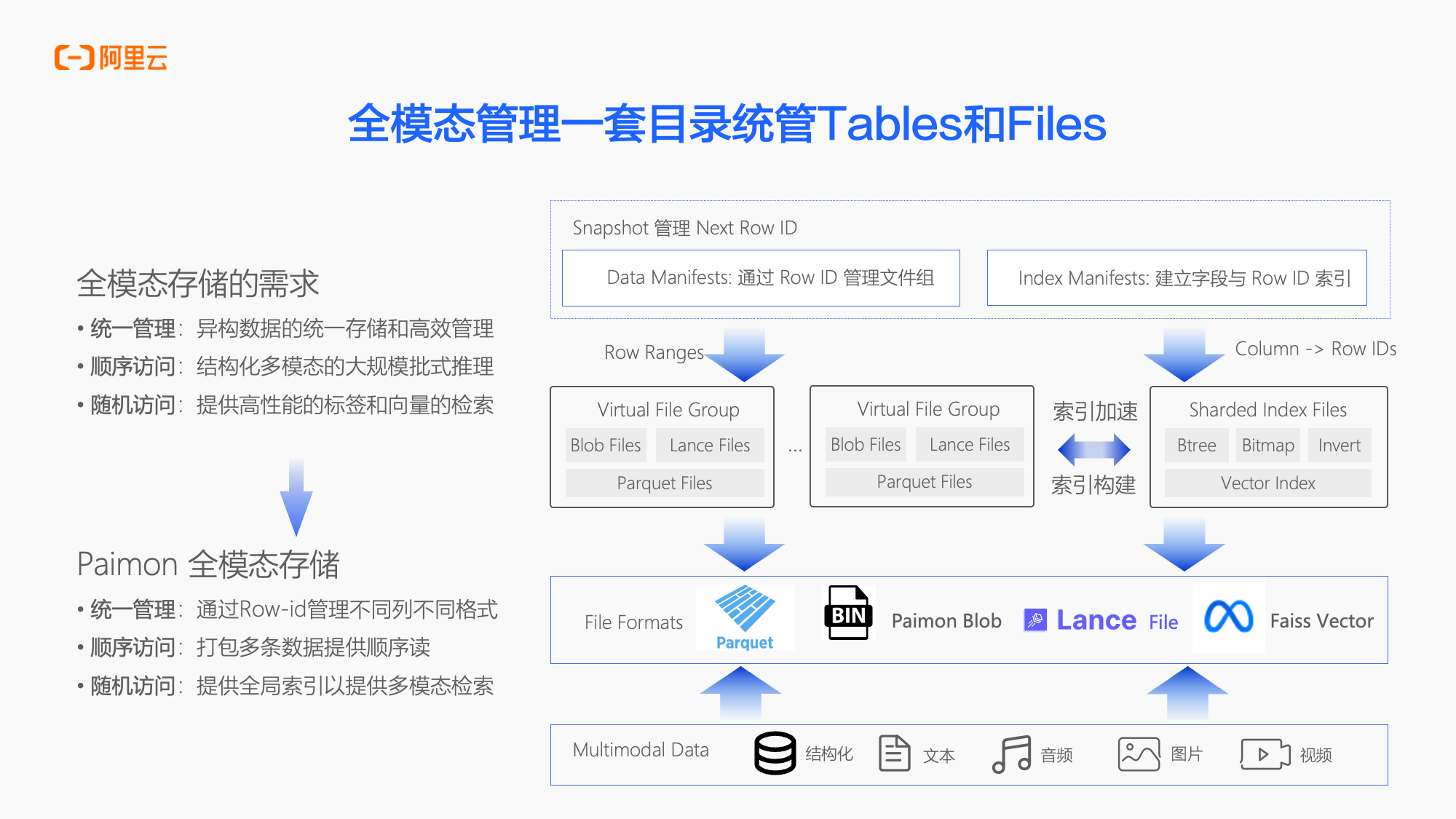 Paimon作为DLF 3.0的核心表格式,在全模态存储方面进行了深度创新。全模态存储面临三大核心需求:统一管理异构数据的能力、支持结构化和多模态数据的顺序访问(用于大规模批式推理)、提供高性能的标签和向量检索(支持随机访问)。