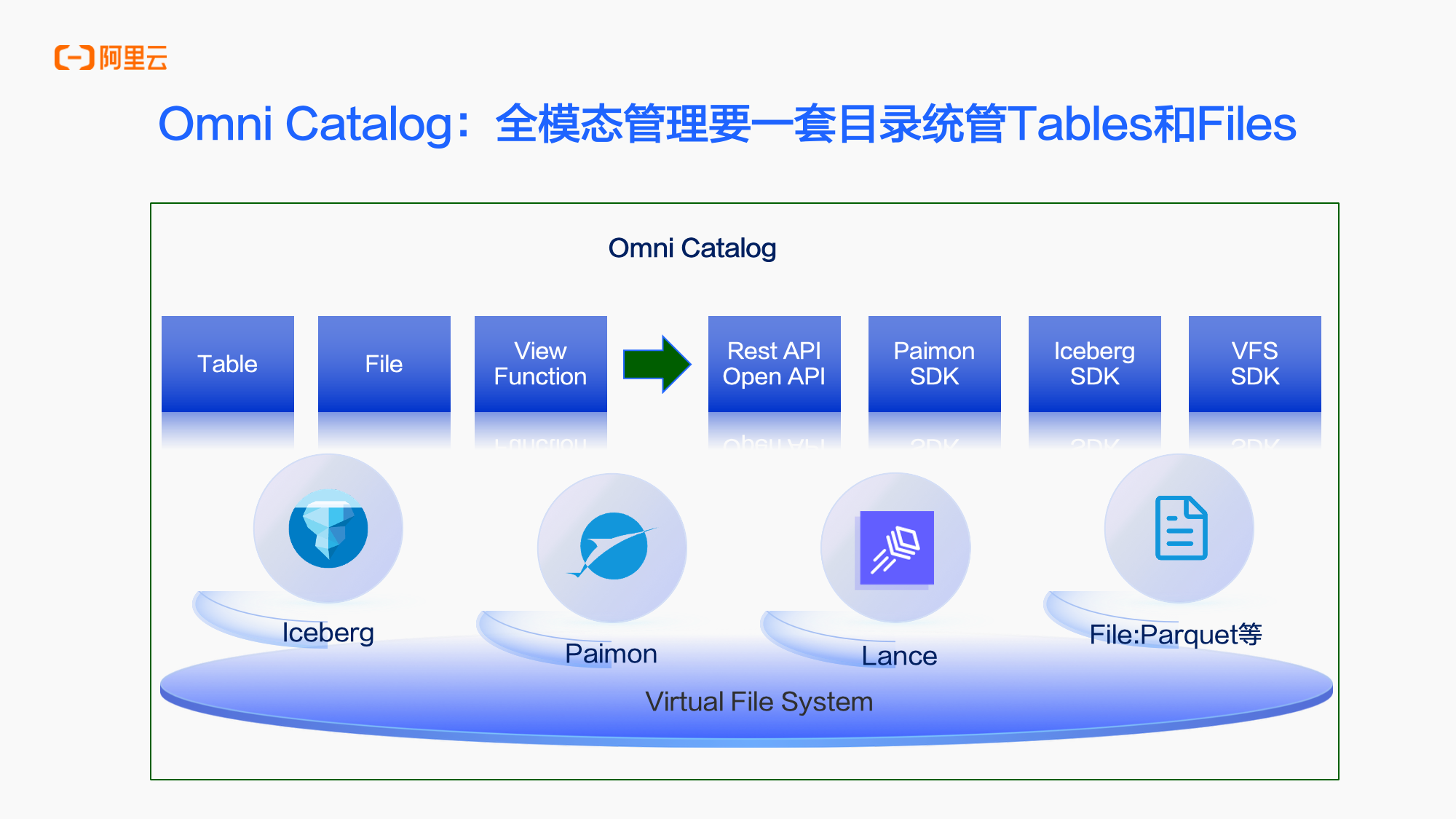 在全模态时代,元数据管理面临前所未有的挑战。传统的Catalog只需要管理Tables、Views、Functions等结构化对象,而在AI场景下,还需要管理各种文件(Files)、向量索引、Blob数据等非结构化对象。如果不同类型的数据使用不同的Catalog或System进行管理,就会产生新的数据孤岛,计算引擎需要跨不同的Catalog进行处理,大幅增加了复杂度。