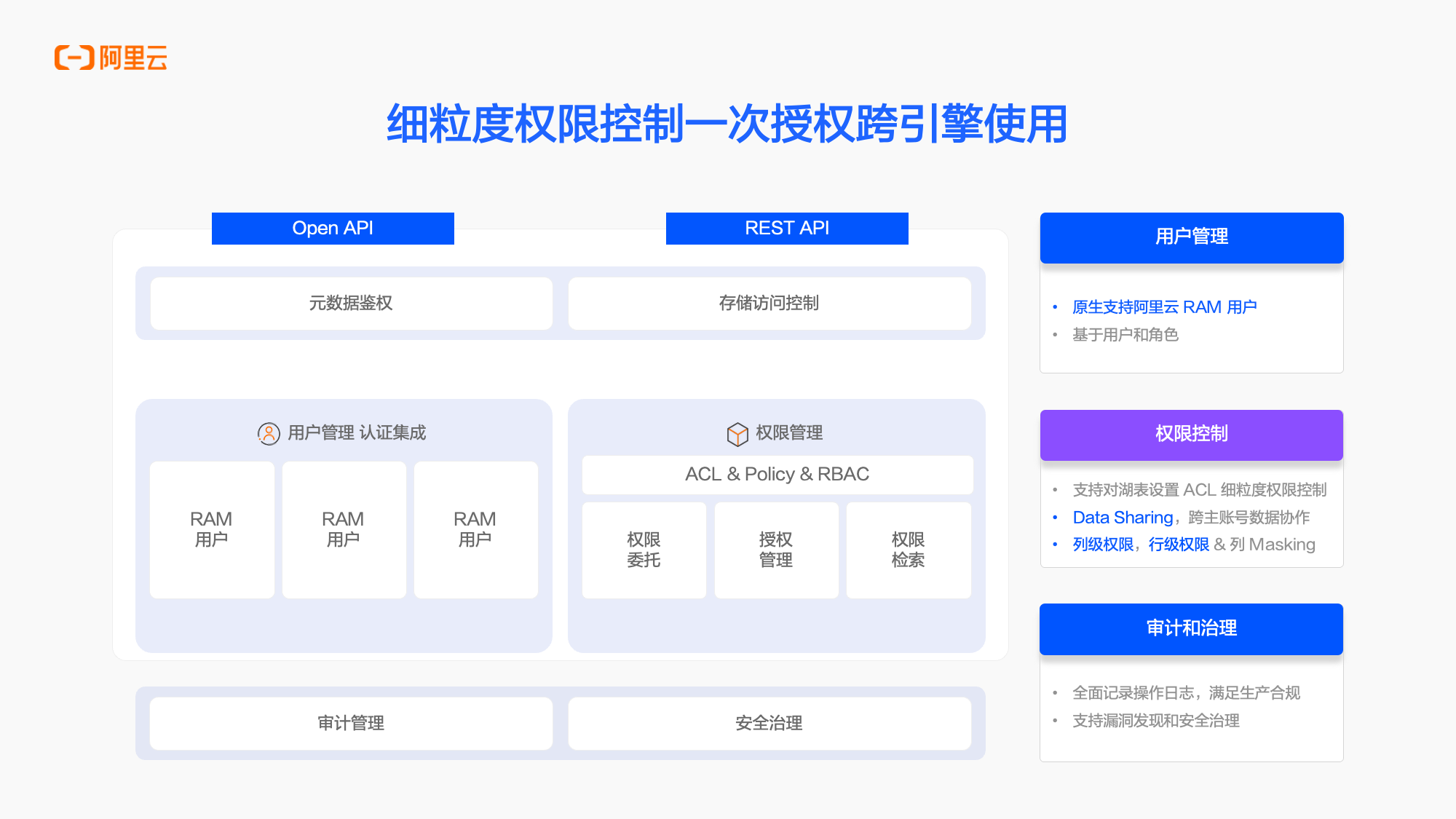 在用户管理方面,DLF 3.0原生支持阿里云RAM用户体系,基于用户和角色进行权限管理。用户可以通过Open API和REST API进行编程式的权限配置,也可以通过控制台进行可视化管理。