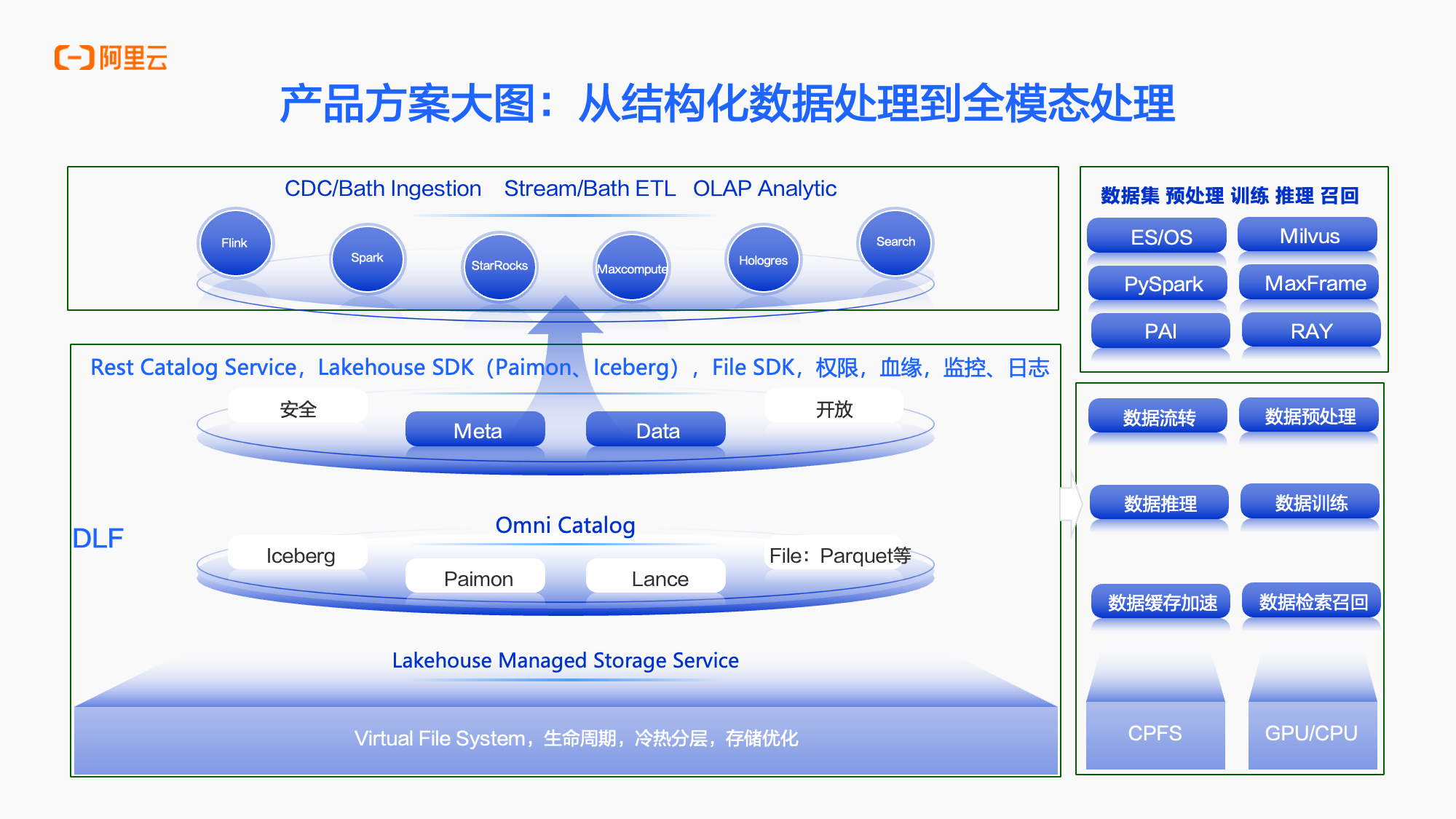 两条链路并非孤立存在,而是通过统一的Omni Catalog和DLF元数据服务实现了深度融合。底层的Lakehouse Managed Storage Service提供了统一的存储层,支持Virtual File System、生命周期管理、冷热分层、存储优化等能力。数据缓存加速服务CPFS进一步提升了GPU/CPU的数据读取效率,为AI训练和推理提供了高性能保障。