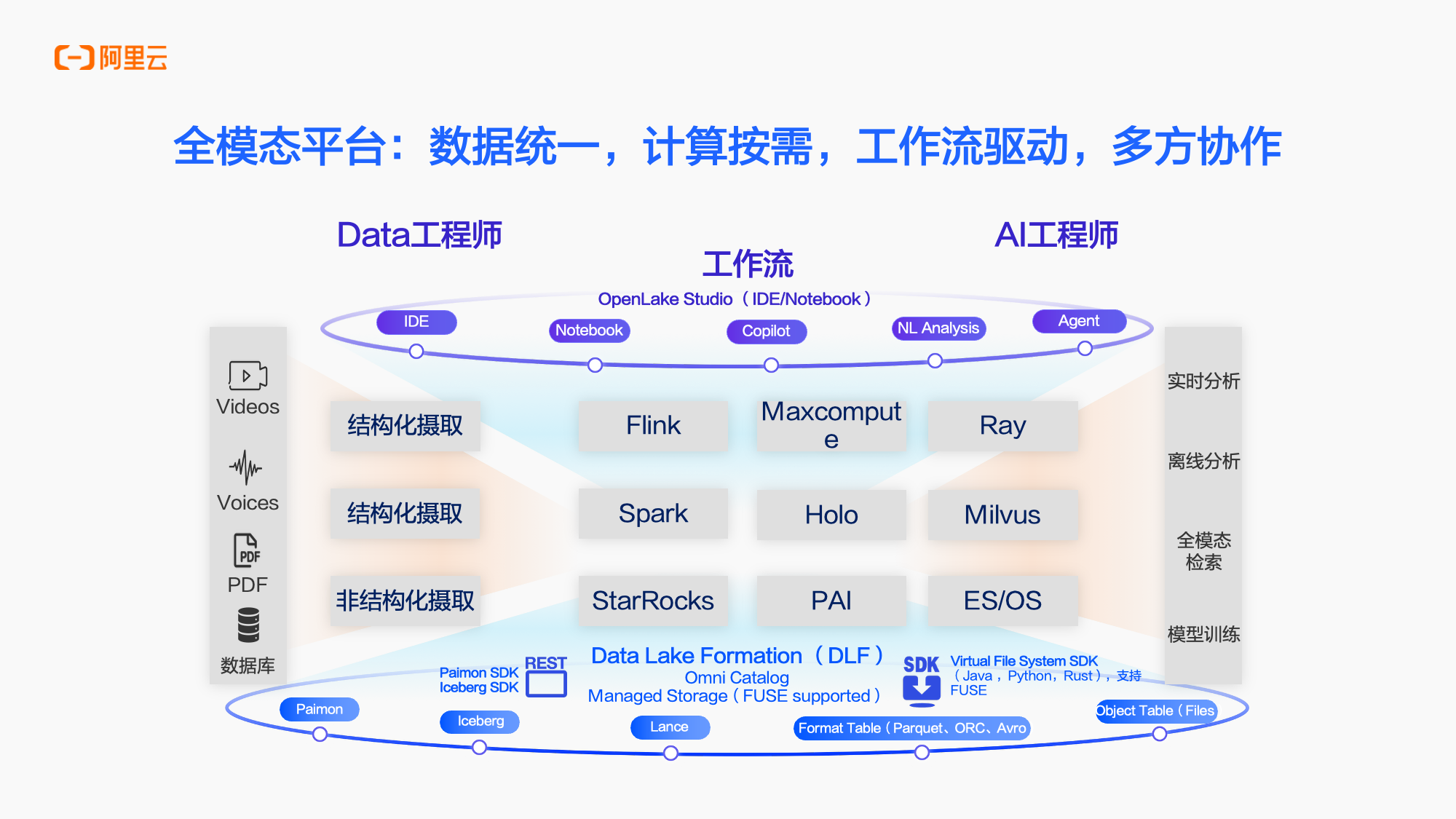 DLF作为统一的湖仓管理平台,提供了Rest Catalog Service、Lakehouse SDK(Paimon、Iceberg)、File SDK、权限管理、血缘追踪、监控日志等完整的企业级能力。这种架构设计使得同一份数据可以同时服务于传统的数据分析场景和新兴的AI应用场景,真正实现了Data+AI一体化。