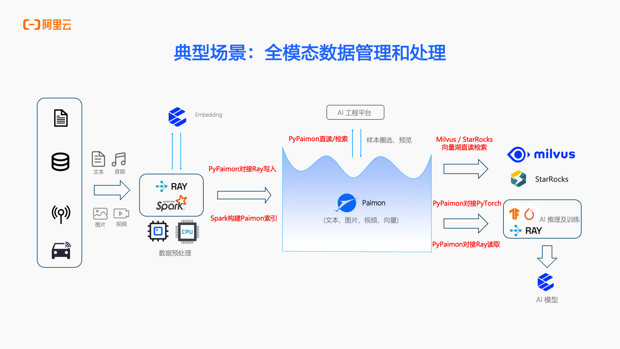 在全模态数据管理和处理场景中,音频、文本、图片、视频等多模态数据通过统一的采集入湖,经过Spark或Ray进行预处理(如文本Chunking、Embedding等),将结构化标签、向量、Blob数据统一存储在一张Paimon表中。AI工程师可以通过Milvus或StarRocks进行向量检索和标量过滤,实现样本圈选和预览。PyPaimon直接对接Ray和PyTorch,支持数据加载和模型训练,整个流程端到端打通,数据无需跨系统迁移。