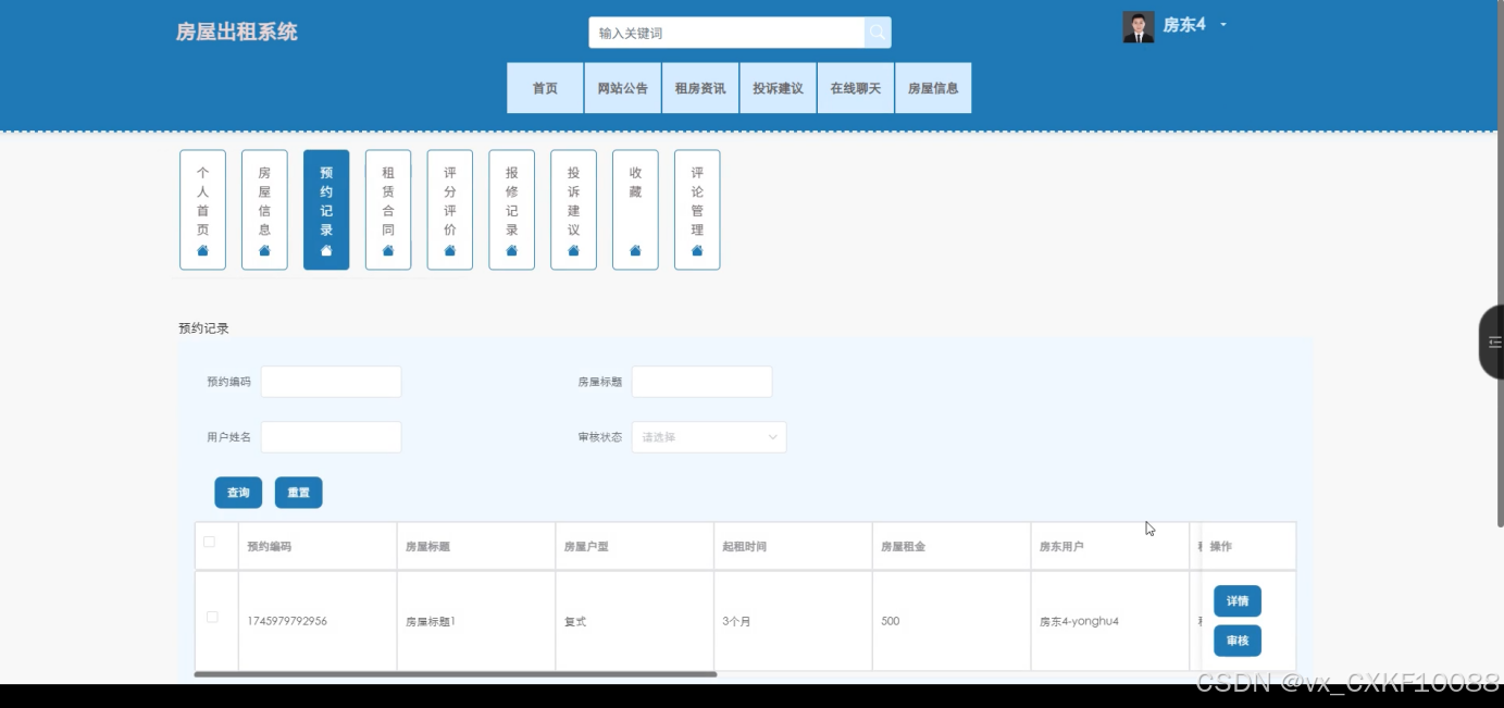 房东可以查看所有租客提交的预约记录,包括预约的时间、租客信息、预约的房源等。房东可以根据预约记录与租客进行进一步沟通,确认租赁细节,并处理预约申请。界面如下图所示。