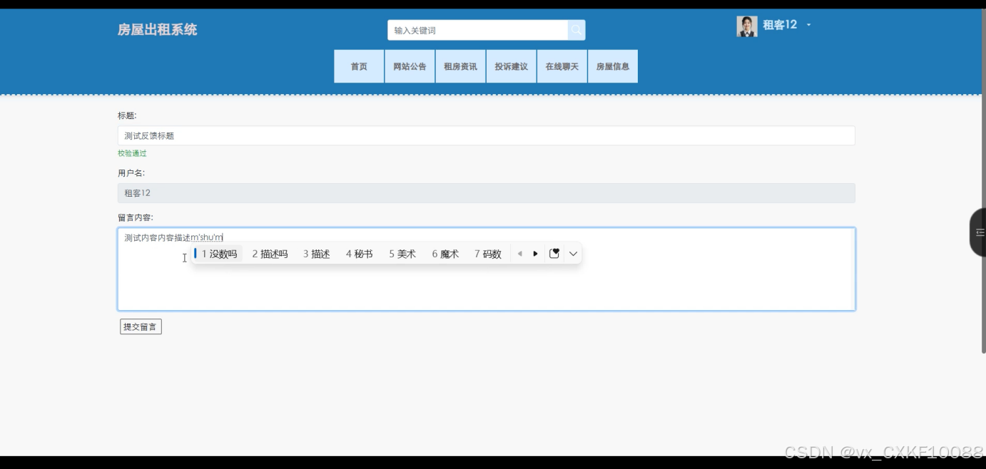 租客可以提交投诉或建议,反馈房源质量或平台服务问题。界面如下图所示。