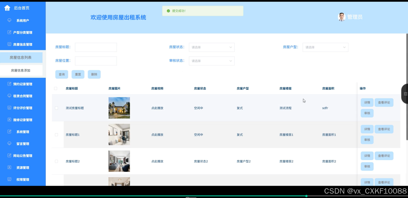 管理员点击"房屋信息管理"这一菜单会显示房屋信息列表这个子菜单,点击"房屋信息列表"可以查看房屋信息详情和用户评论,可以进行查询、重置、删除、审核等操作。点击"房型分类添加",管理员可以添加新的房型分类。房屋信息管理界面如下图所示。