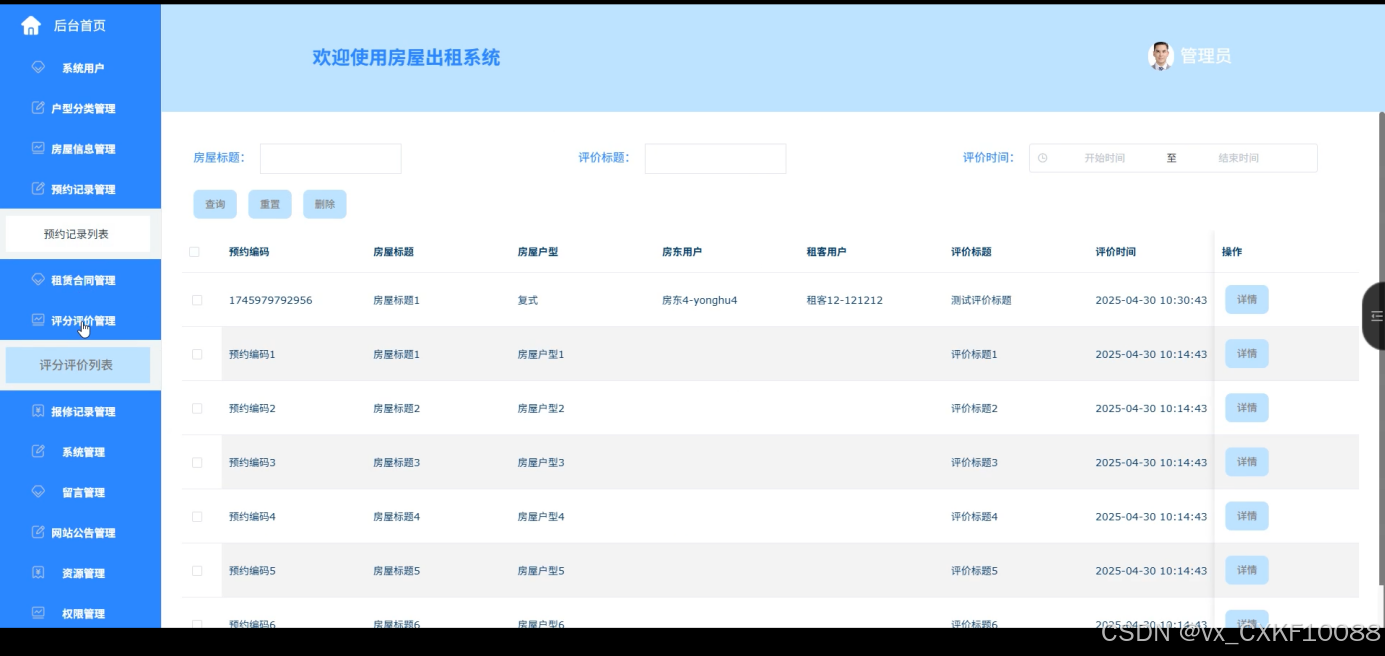 管理员点击"评分评价管理"这一菜单会显示评分评价列表这个子菜单,点击"评分评价列表"可以查看评分评价详情,可以进行查询、重置和删除等操作。评分评价管理界面如下图所示。
