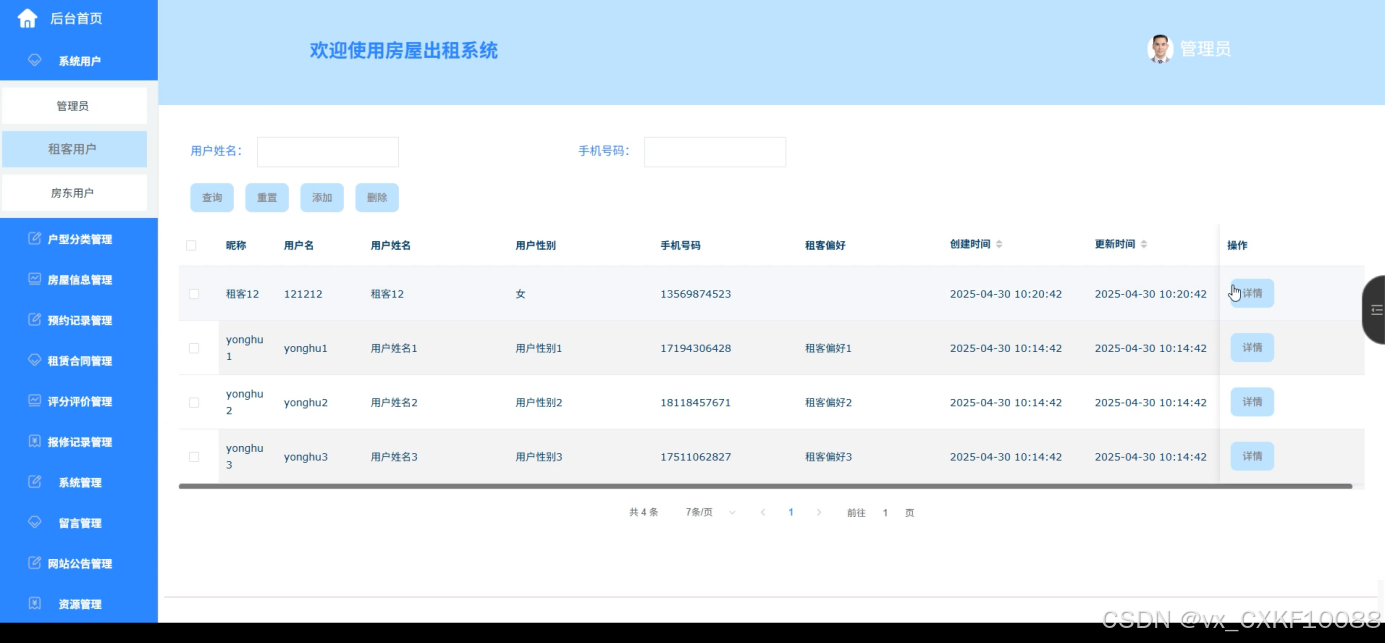 在"系统用户"模块下,管理员可以管理系统上的三类用户:管理员、租客用户和房东用户。管理员可以进行用户的增、删、改、查操作,包括设置权限、修改用户信息等。系统用户界面如下图所示。