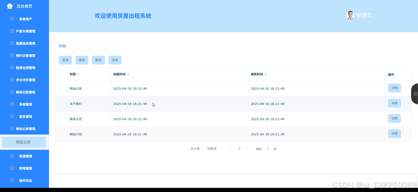 管理员点击"网站公告管理"这个菜单,可以对系统中的网站公告进行管理,包括公告的增删改查等操作。网站公告管理界面如下图所示。
