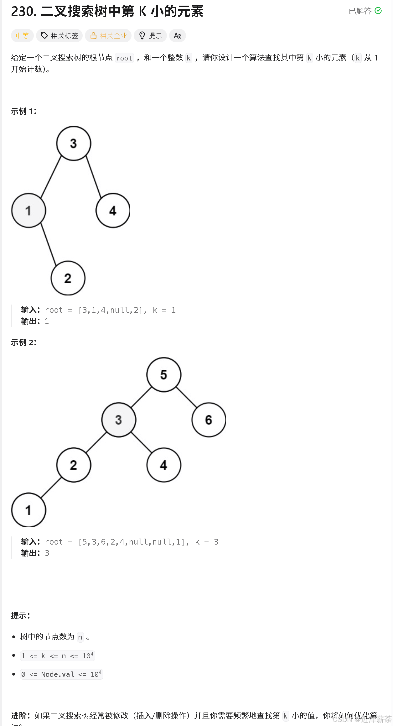 二叉搜索树中第 K 小的元素