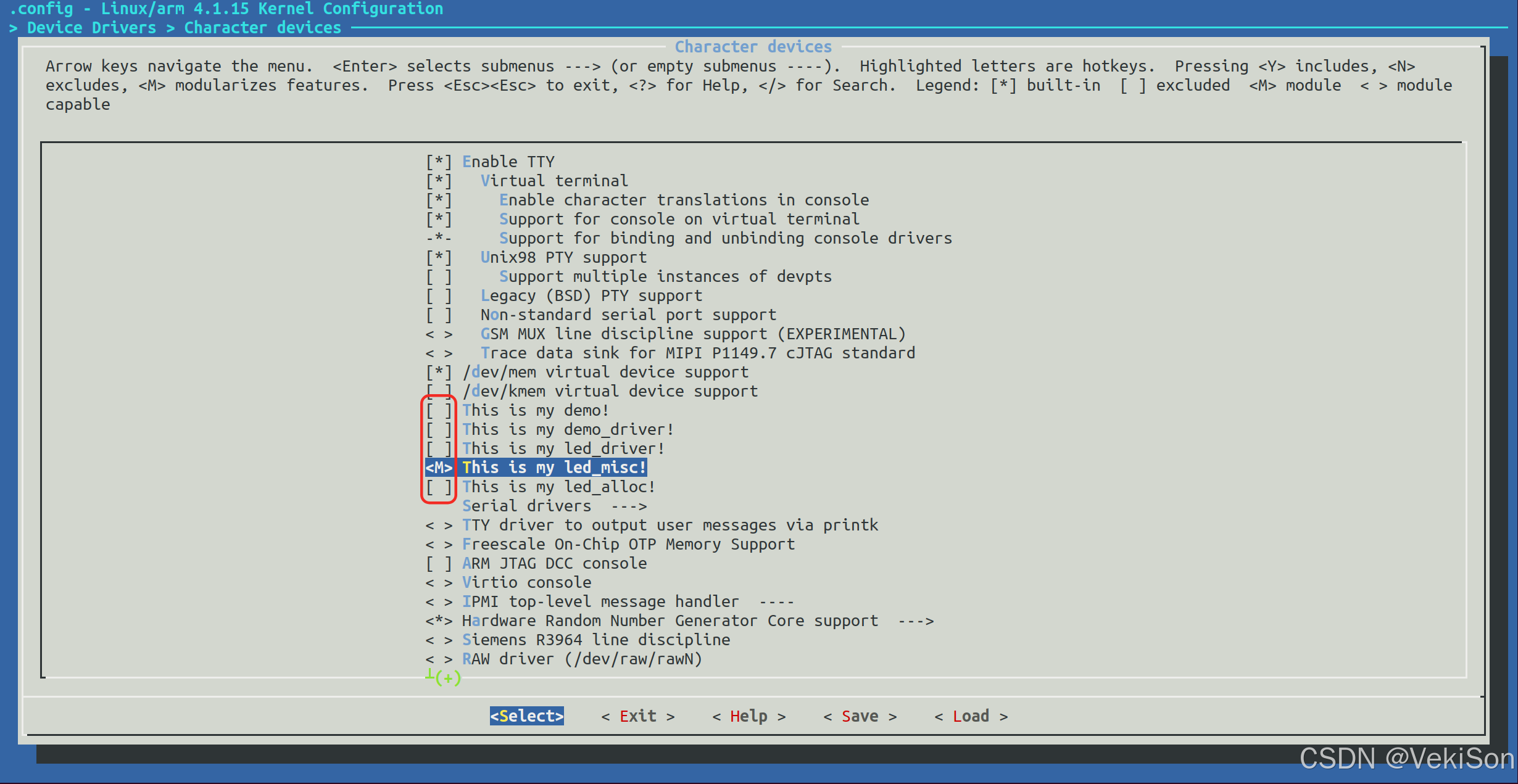 找到 Device Drivers → Character devices,将自己添加的程序取消选择,并将杂项设备驱动 led_msic 设置为 M: