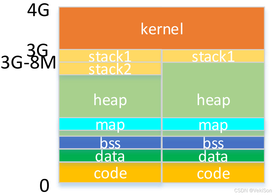 | stack | 线程独享空间 | 存储局部变量、函数参数等,每个线程独立栈(8MB) |