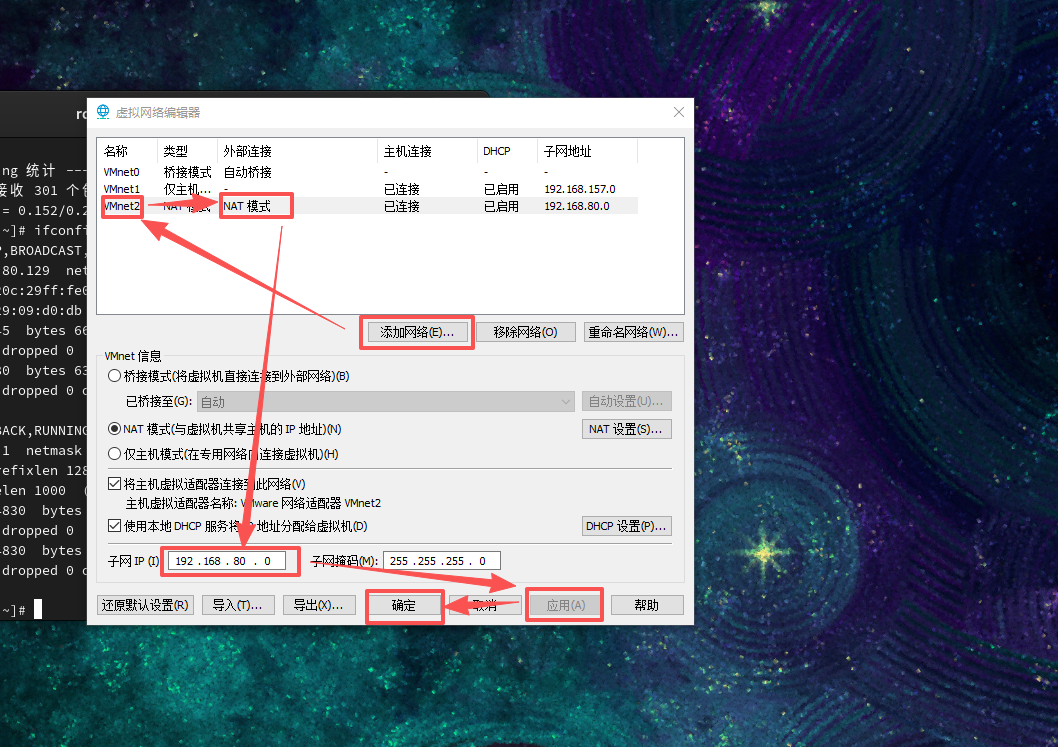 这里NAT模式可以写成其他的,如果写成其他的,无法访问互联网,完成之后在网络设置那里编辑一下,使用新添加的网卡