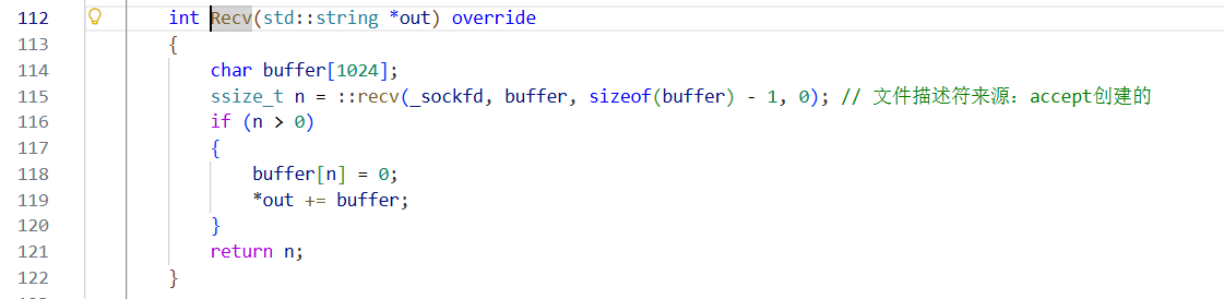 ssize_t n = ::recv(_sockfd, buffer, sizeof(buffer) - 1, 0); // 文件描述符来源:accept创建的