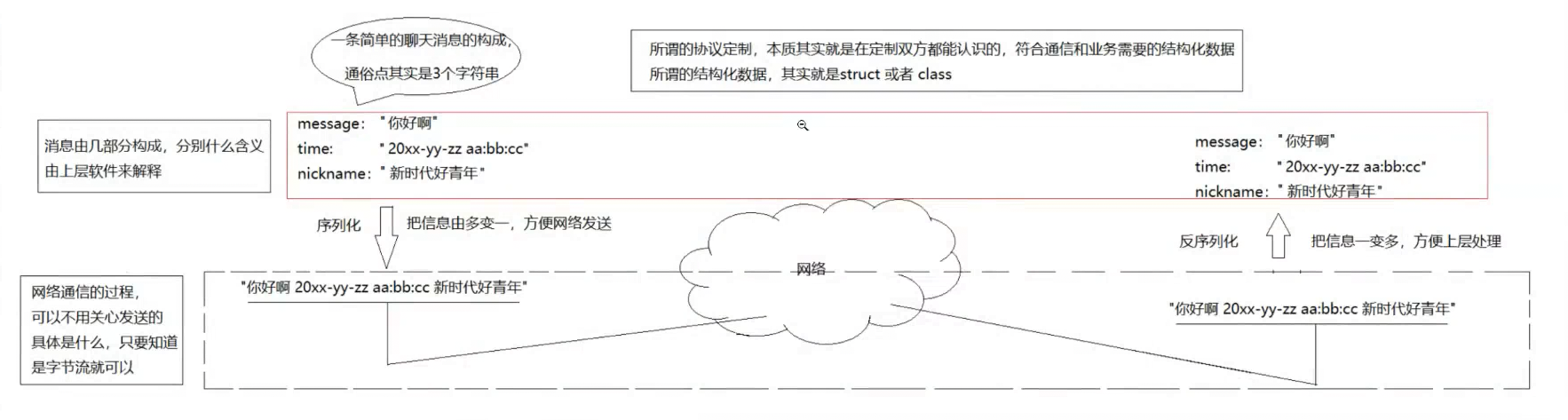 我们在进行QQ聊天的时候,聊天时的界面不只是显示我们聊天的内容(本质是string),还会显示昵称(本质是string),头像(本质是图片的路径)。这3个数据进行网络传输的时候,不是分开传输的。