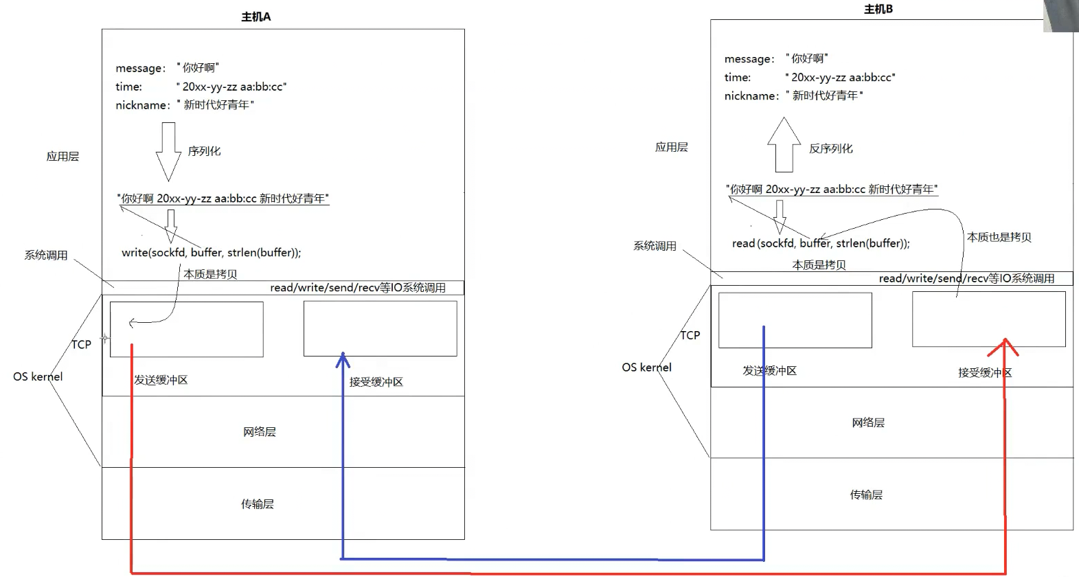 - 主机间的通信本质:把发送方的发送缓冲区内部的数据拷贝到对端的接收缓冲区。
