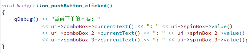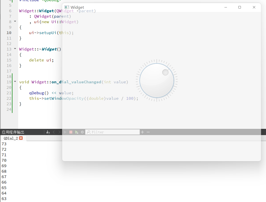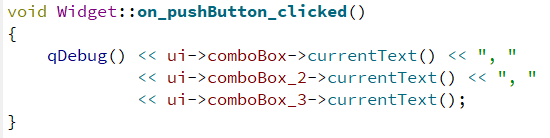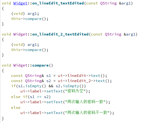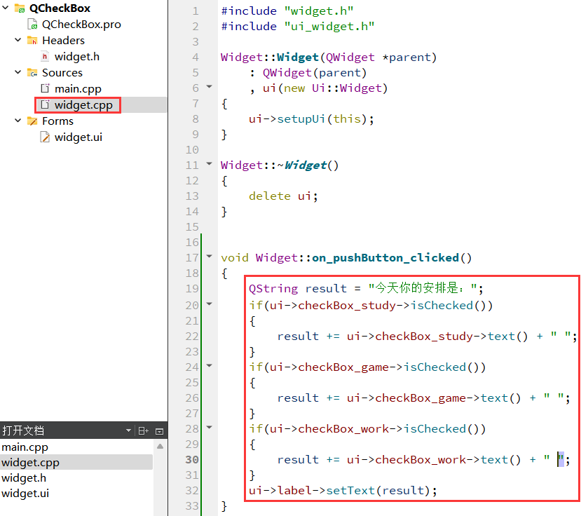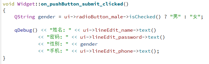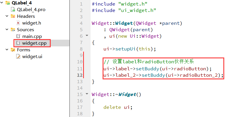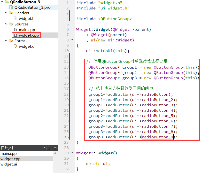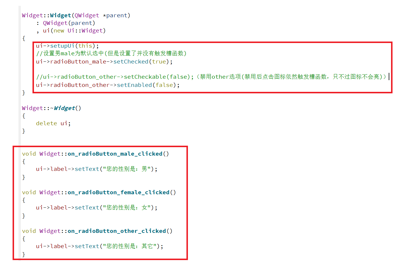 (2)修改 widget.cpp,编辑三个 QRadioButton 的 slot 函数