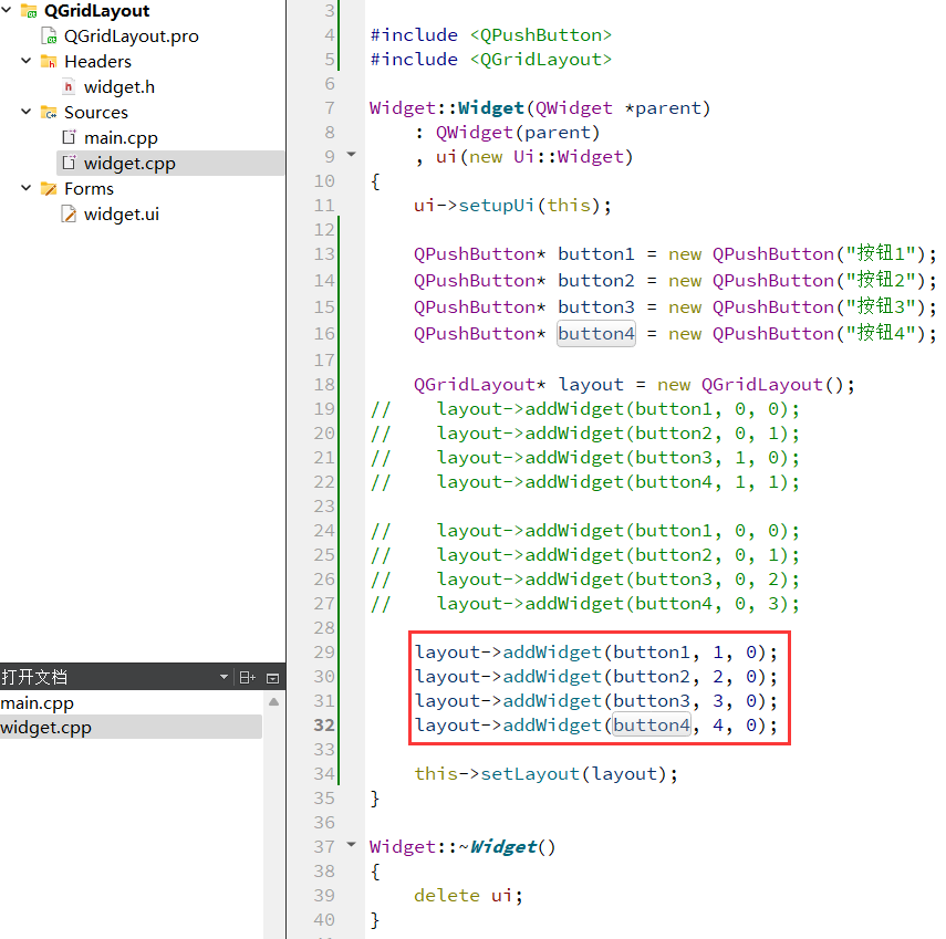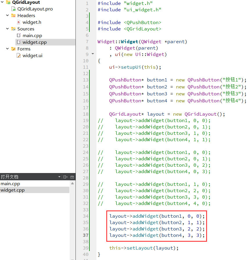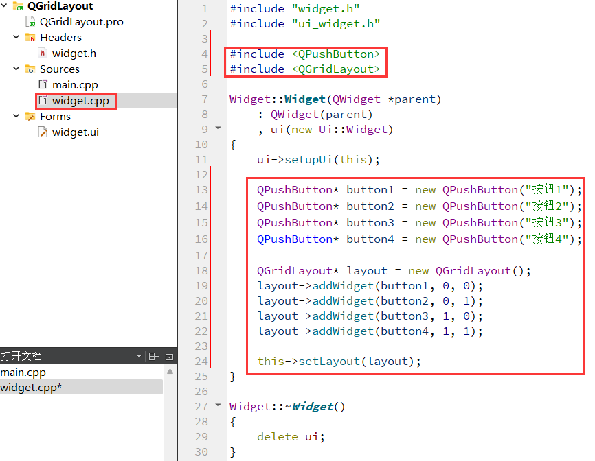 (1)代码中创建 QGridLayout 和 4 个按钮