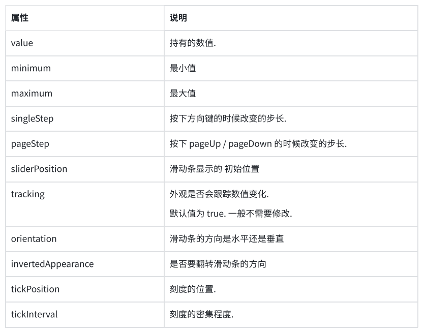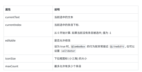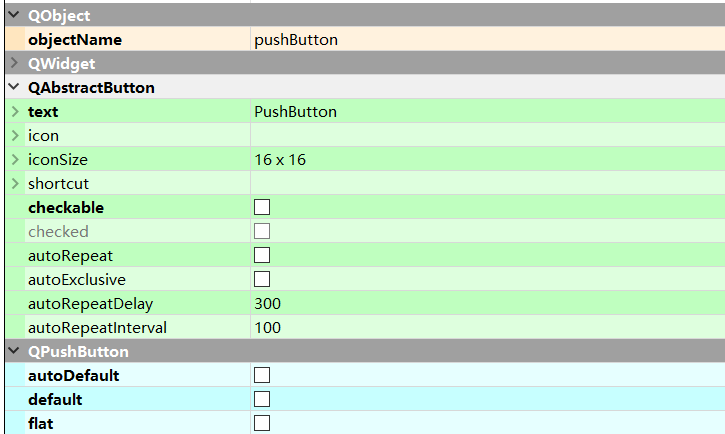 - QAbstractButton 作为 QWidget 的子类,当然也继承了 QWidget 的属性。上面介绍的 QWidget 里的各种属性用法,对于 QAbstractButton 同样适勇。因此表格仅列出 QAbstractButton 独有的属性。
