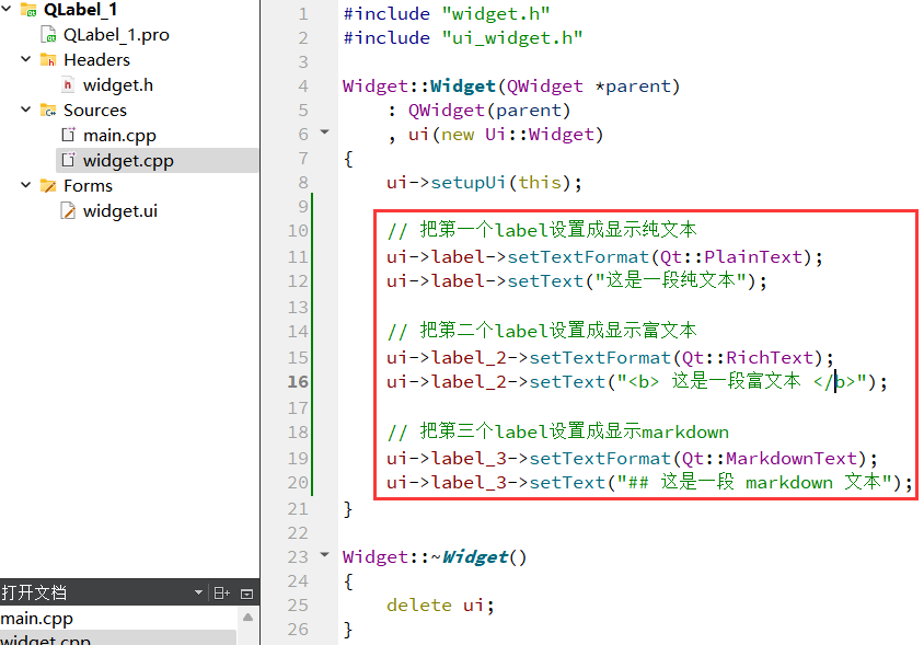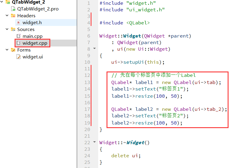 (2)编写 widget.cpp,进行初始化,给标签页中放个简单的 label