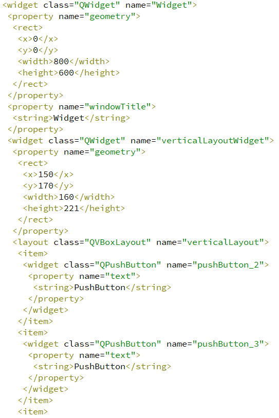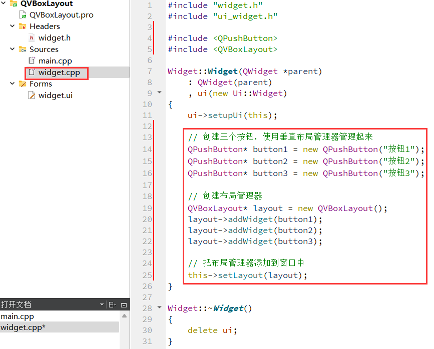 使用 QVBoxLayout 表示垂直的布局管理器,V 是 vertical 的缩写。