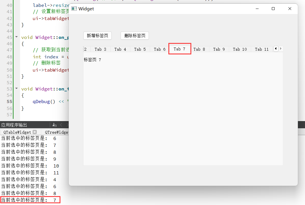 - 切换标签页时,可以看到 qDebug 打印出的标签页编号