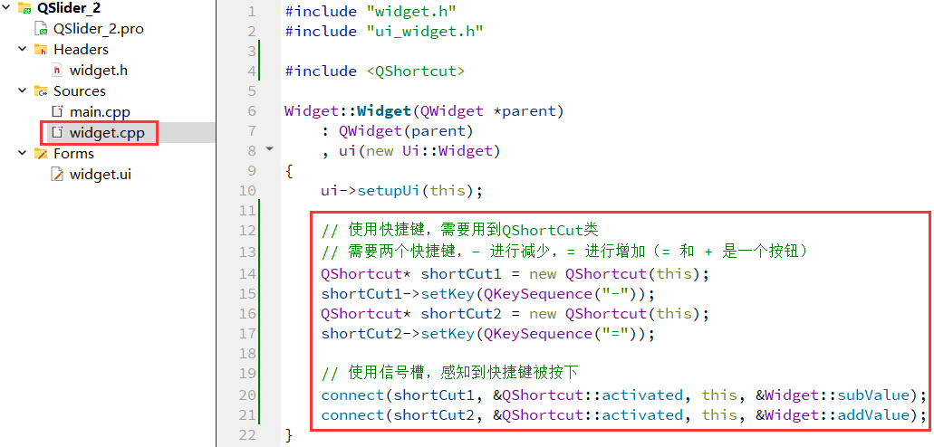 - 使用 setShortcut 给按钮设置快捷键,参数是⼀个 QKeySequence 对象,表示一个按键序列,支持持组合键(Ctrl + C 这种)。