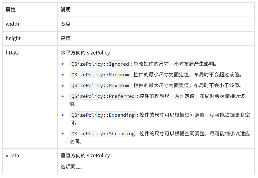 - QSizePolicy::Ignored:忽略控件的尺寸,不对布局产生影响。