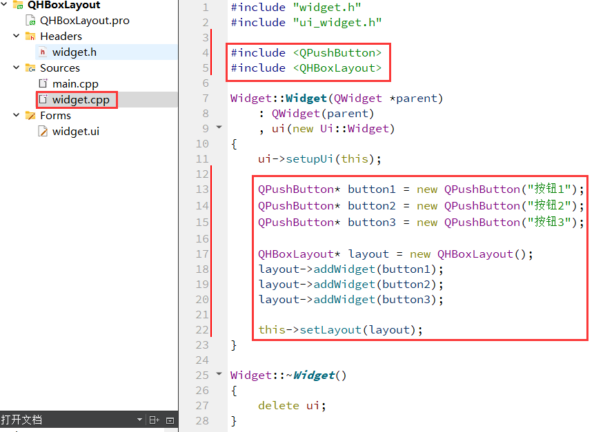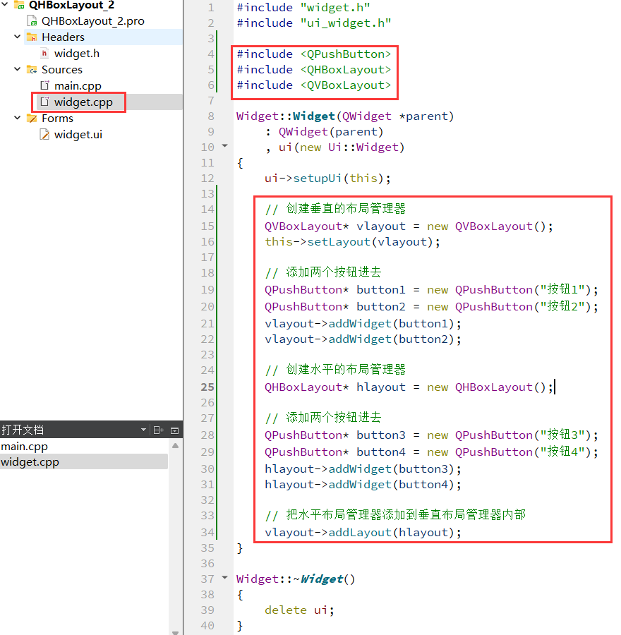 使用 QHBoxLayout 表示垂直的布局管理器,H 是 horizontal 的缩写。