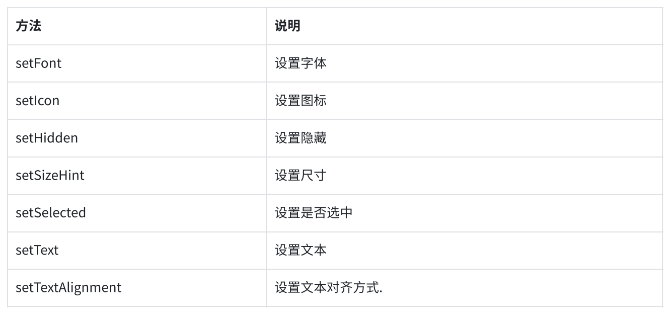 - Qt 的 api 设计风格是非常清晰的,此处列出的属性都是可以获取和设置的。例如,使用 text() 获取按钮文本,使用 setText() 设置文本。