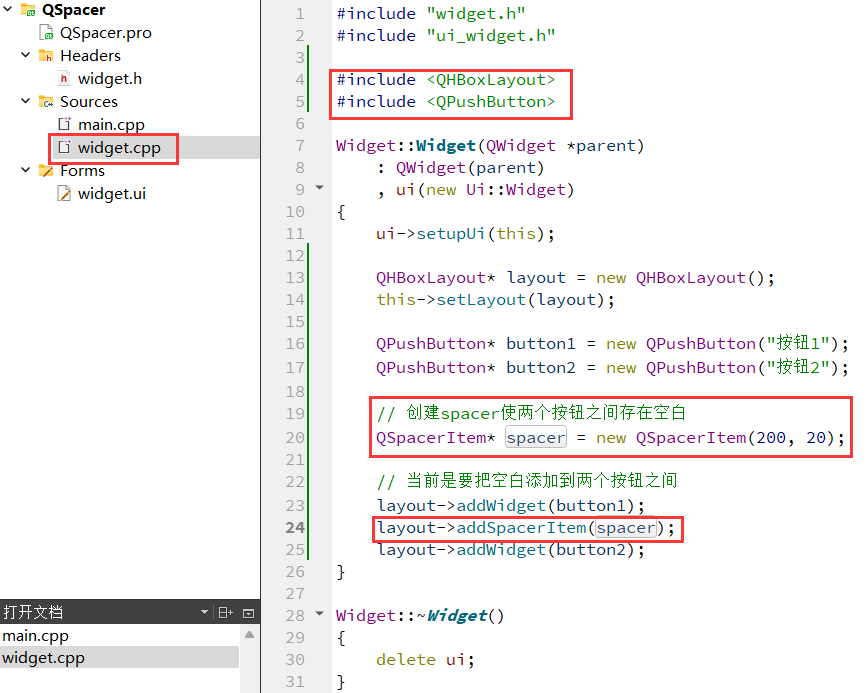 使用布局管理器的时候,可能需要在控件之间添加一段空白,就可以使用 QSpacerItem 来表示。