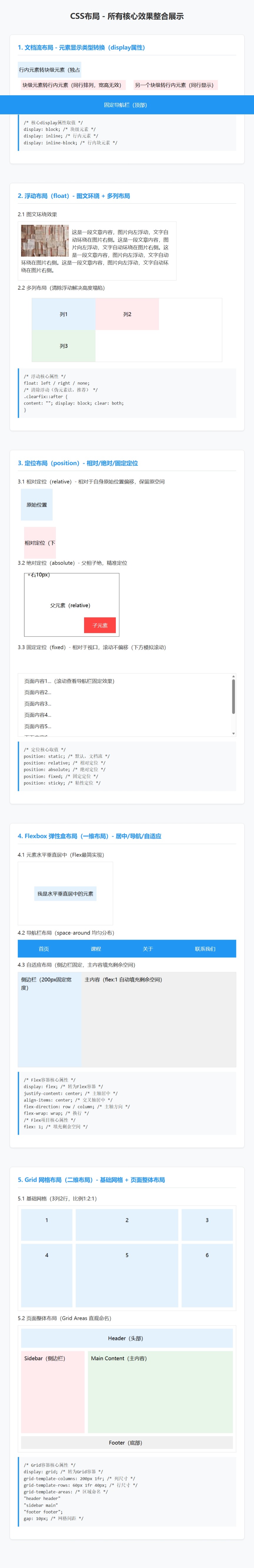 本阶段核心目标:掌握CSS中主流的布局方式(文档流、浮动、定位、Flexbox、Grid),能根据不同的页面需求选择合适的布局方案,实现从简单的元素排列到复杂的页面整体结构搭建,解决"元素排列混乱""垂直居中困难""响应式适配"等布局难题。
