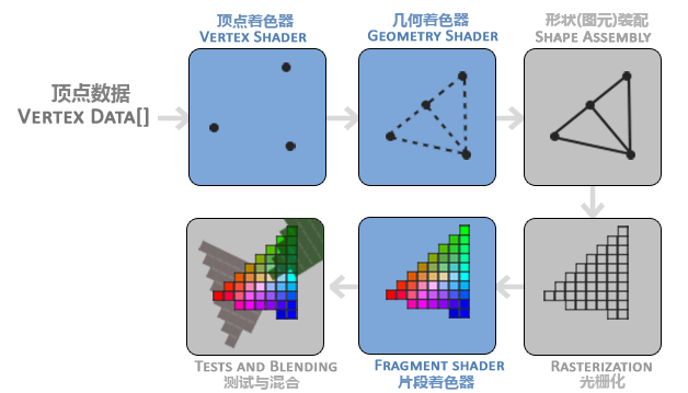 绘制流程比较繁琐,然而,我们能配置的只有三个蓝色的着色器部分,即:顶点着色器、 几何着色器(可选)和片段着色器,一般只需配置顶点着色器和片段着色器即可。