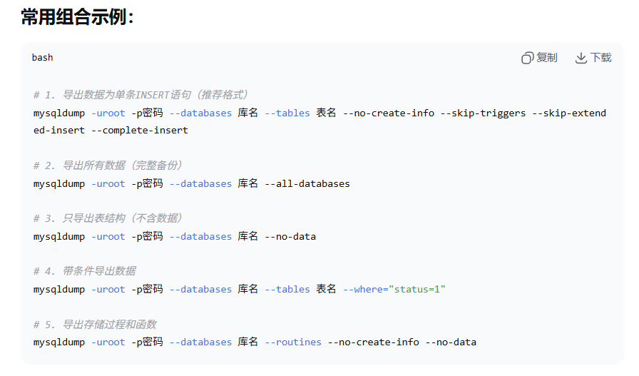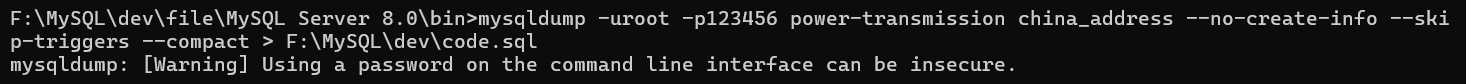 mysqldump -u账号 -p密码 --databases 数据库名 --tables 表名 --no-create-info --skip-triggers --skip-extended-insert --complete-insert > F:\MySQL\dev\code.sql