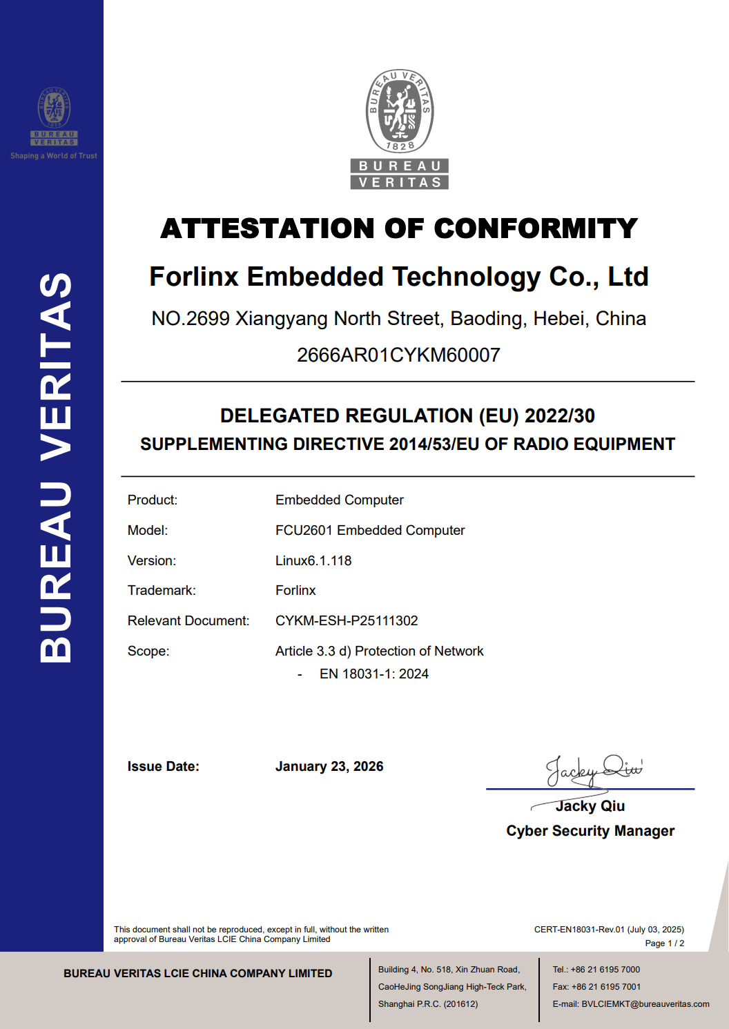 如今,这张证书早已不是 "加分项",而是电子产品出海的 "必备通行证"------ 没有它,产品即便性能再优也难以敲开国际市场的大门。飞凌嵌入式FCU2601嵌入式控制单元的认证通过,意味着该产品已完全满足欧盟网络安全法规要求,具备了全球市场的准入资质。