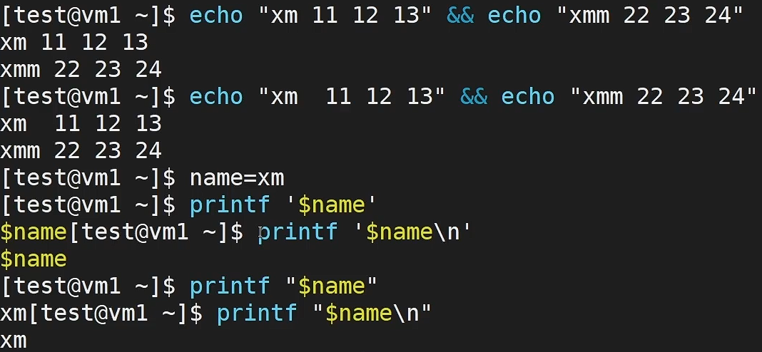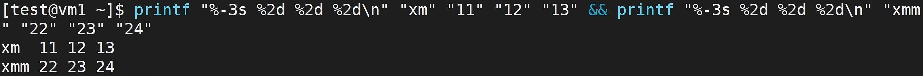 - printf "%-3s %2d %2d %2d" "xm" "11" "12" "13" && printf "%-3s %2d %2d %2d\n" "xmm" "22" "23" "24" (两个命令要用&&连接)