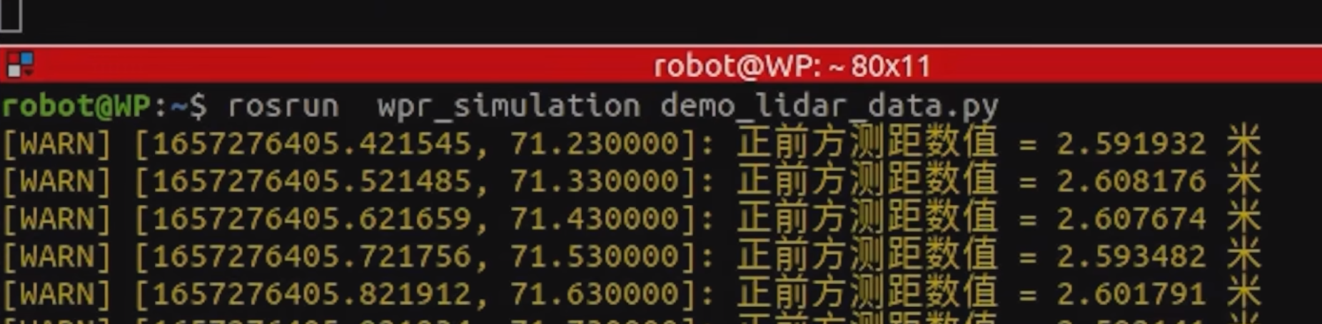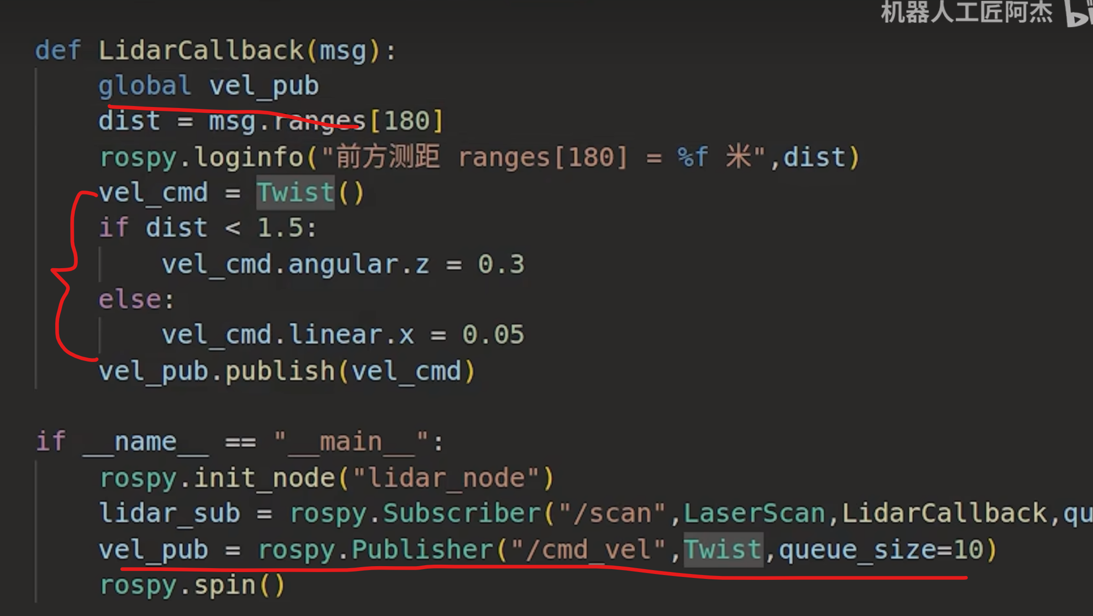 rospy.loginfo:以 INFO 级别打印日志,显示前方距离