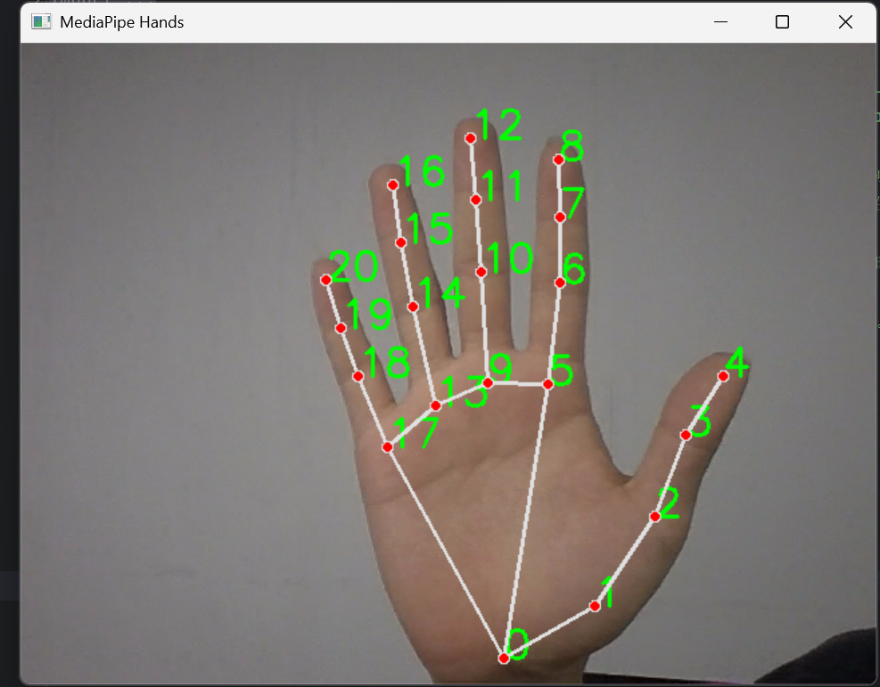 补充:21个关键点的编号规则(新手必备):0是手腕,1~4是拇指(4为指尖),5~8是食指(8为指尖),9~12是中指,13~16是无名指,17~20是小指,掌握编号规则,后续可轻松实现手势判断(如比耶、点赞等)。