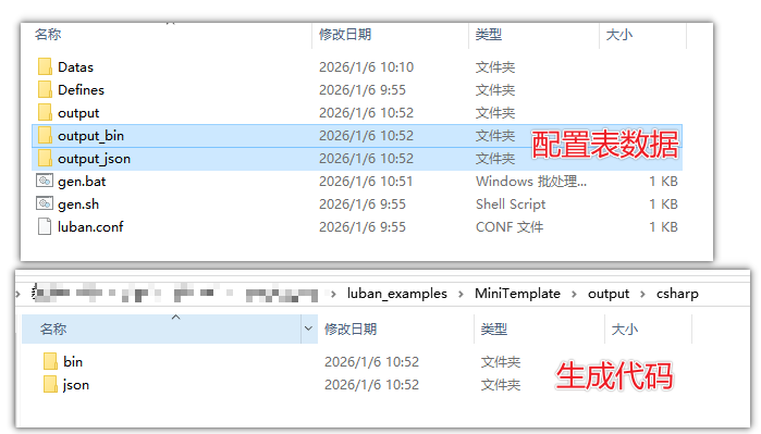 执行gen.bat之后就生成了配置表数据和代码,分别生成到了指定的文件夹。