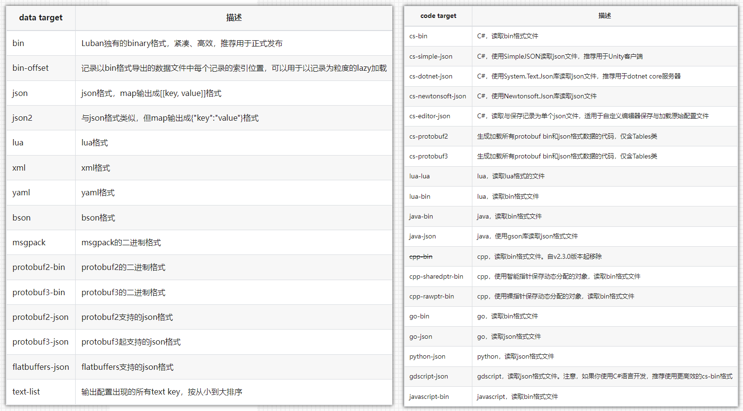 codeTarget cs-simple-json中cs表示生成c#语言代码,simple表示使用SimpleJson加载json文件,json表示加载json数据。所有的codeTarget都遵循这个命名规则。