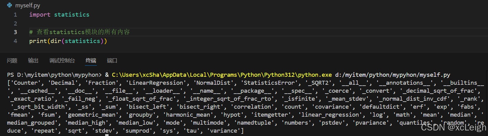 其中,带小写字母的(如 mean、median)就是我们常用的统计函数,StatisticsError 是模块专属的异常类(用于处理统计计算中的错误)。