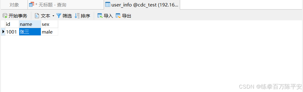 SourceRecord{sourcePartition={server=mysql_binlog_source}, sourceOffset={ts_sec=1770337470, file=binlog.000024, pos=1095}} ConnectRecord{topic='mysql_binlog_source.cdc_test.user_info', kafkaPartition=null, key=Struct{id=1001}, keySchema=Schema{mysql_binlog_source.cdc_test.user_info.Key:STRUCT}, value=Struct{after=Struct{id=1001,name=张三,sex=male},source=Struct{version=1.9.7.Final,connector=mysql,name=mysql_binlog_source,ts_ms=1770337470000,snapshot=last,db=cdc_test,table=user_info,server_id=0,file=binlog.000024,pos=1095,row=0},op=r,ts_ms=1770337469306}, valueSchema=Schema{mysql_binlog_source.cdc_test.user_info.Envelope:STRUCT}, timestamp=null, headers=ConnectHeaders(headers=)}