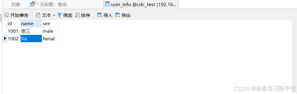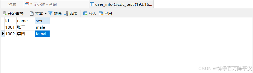 SourceRecord{sourcePartition={server=mysql_binlog_source}, sourceOffset={transaction_id=null, ts_sec=1770338014, file=binlog.000024, pos=1174, row=1, server_id=1, event=2}} ConnectRecord{topic='mysql_binlog_source.cdc_test.user_info', kafkaPartition=null, key=Struct{id=1002}, keySchema=Schema{mysql_binlog_source.cdc_test.user_info.Key:STRUCT}, value=Struct{after=Struct{id=1002,name=李四,sex=famal},source=Struct{version=1.9.7.Final,connector=mysql,name=mysql_binlog_source,ts_ms=1770338014000,db=cdc_test,table=user_info,server_id=1,file=binlog.000024,pos=1322,row=0,thread=26},op=c,ts_ms=1770338013346}, valueSchema=Schema{mysql_binlog_source.cdc_test.user_info.Envelope:STRUCT}, timestamp=null, headers=ConnectHeaders(headers=)}