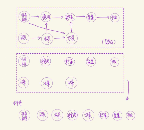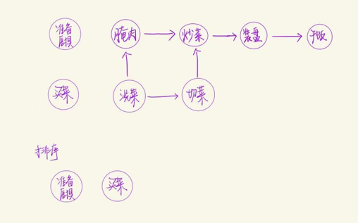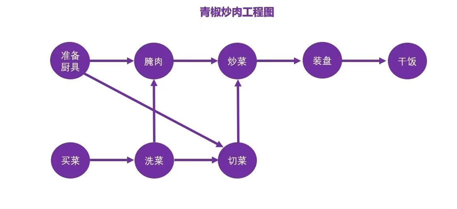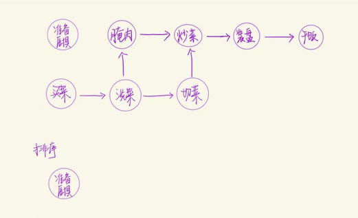拓扑排序(Topological sorting)要解决的问题是如何给一个有向无环图的所有节点排序。简而言之就是找到做一件事情的先后顺序,其中对应的事情就是一个一个的活动。继续拿我们上面的青椒炒肉工程图来进行讲解。
