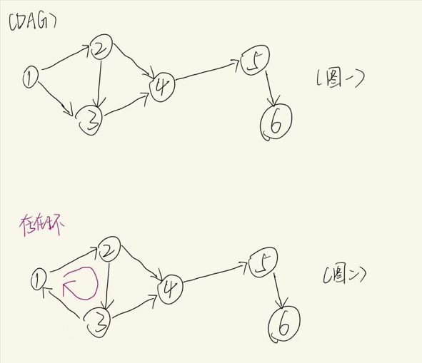 有向无环图:是由顶点和边连接而成的数据结构,图中的边都是有方向的边,无环意味着随意将图中的点提出来,将他们的边组合起来后都是没有环出现的。下图中图一就是有向无环图,图二存在环,不是有向无环图。