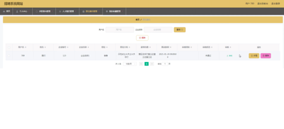 职位邀约管理,在职位邀约管理页面可以查看用户名、姓名、企业编号、企业名称、职位、职位介绍、薪资待遇、面试时间、审核回复、审核状态、审核等信息,并可根据需要进行详情、删除等操作,如图5-10所示。